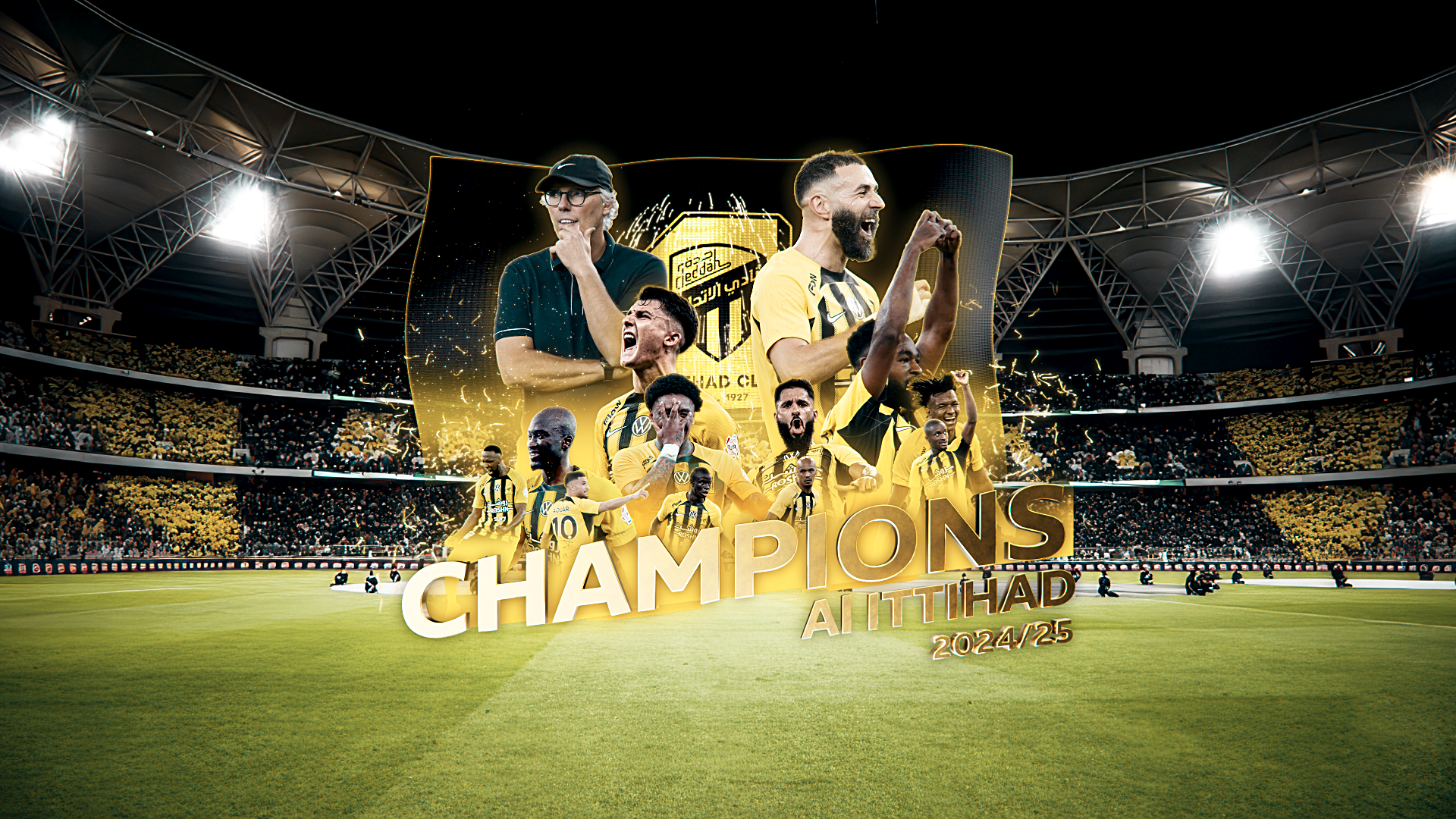 Our initial project was to create a 2.5D graphics animation. This was designed to be separated into layers and positioned in Z-space, allowing for augmented reality implementation during broadcast. The core theme was to celebrate and name this year's champions, Al-Ittihad.